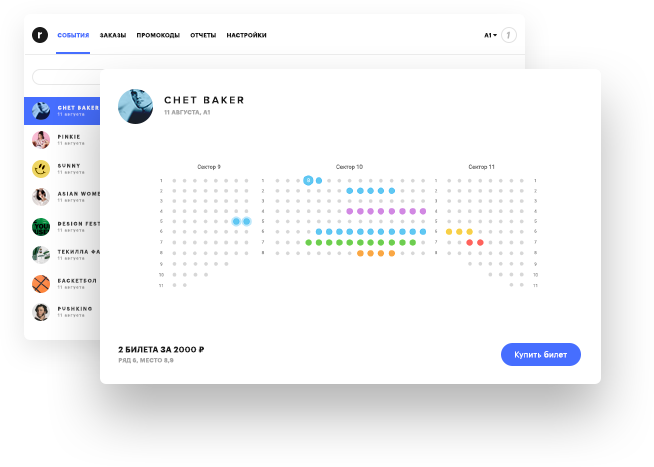 Sell tickets with our partners. More than 30 channels throughout Russia: Kassir.ru, Yandex.Afisha, Ponominalu and others